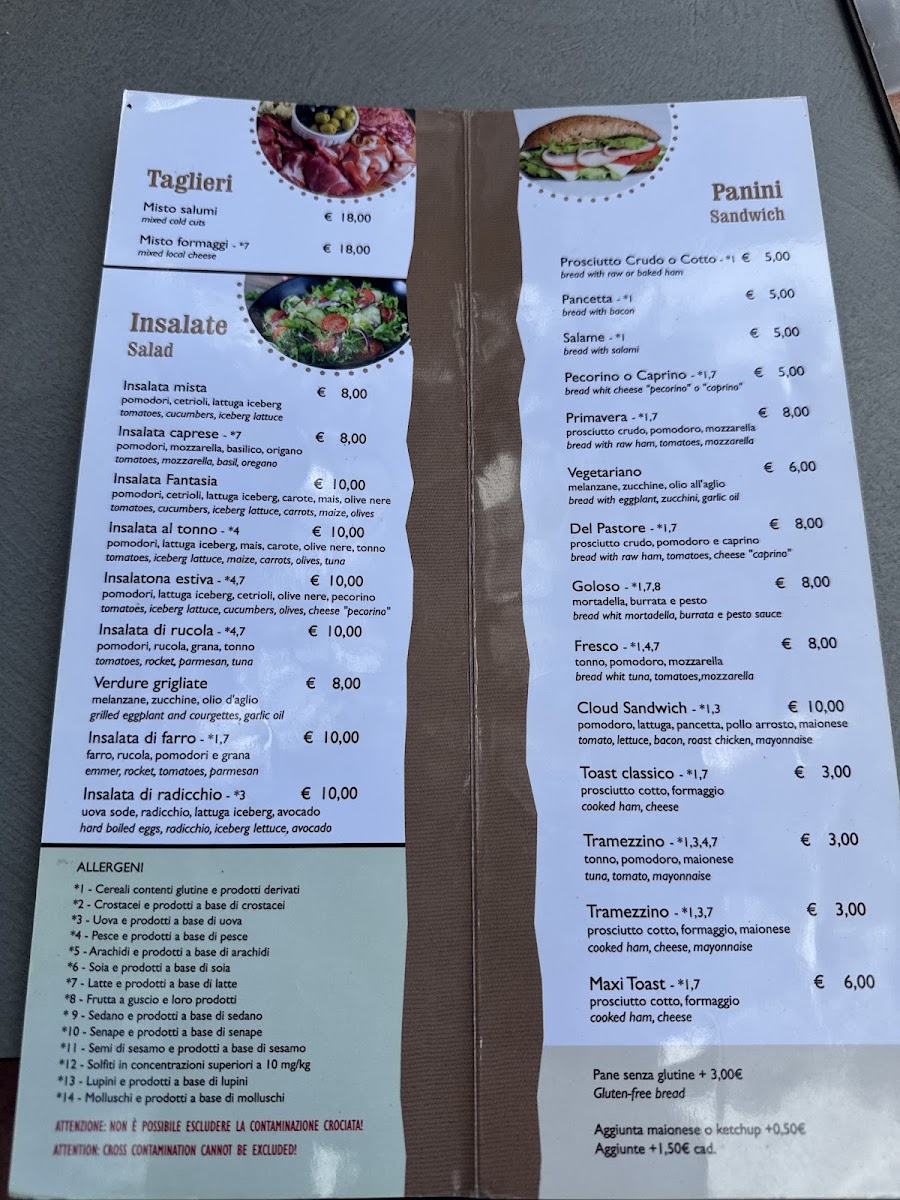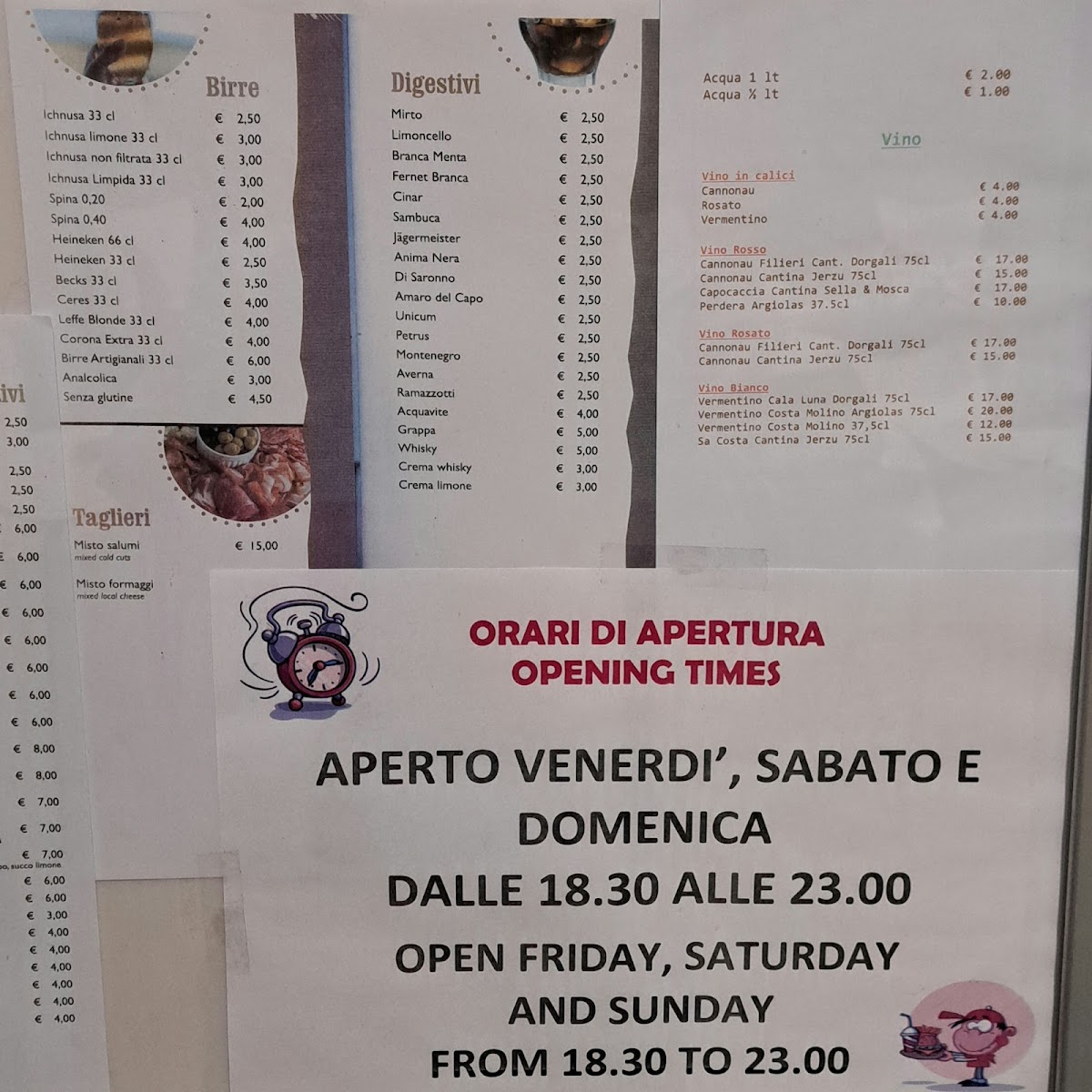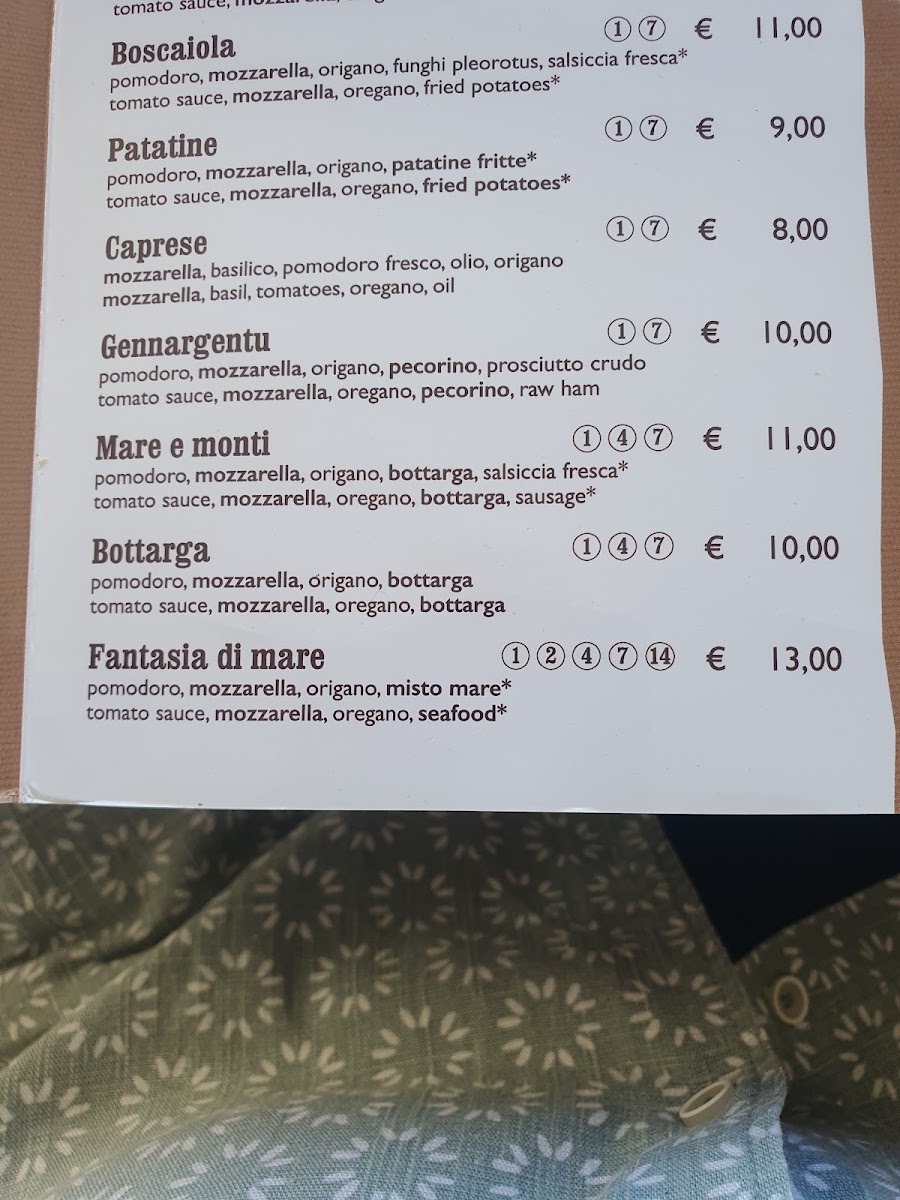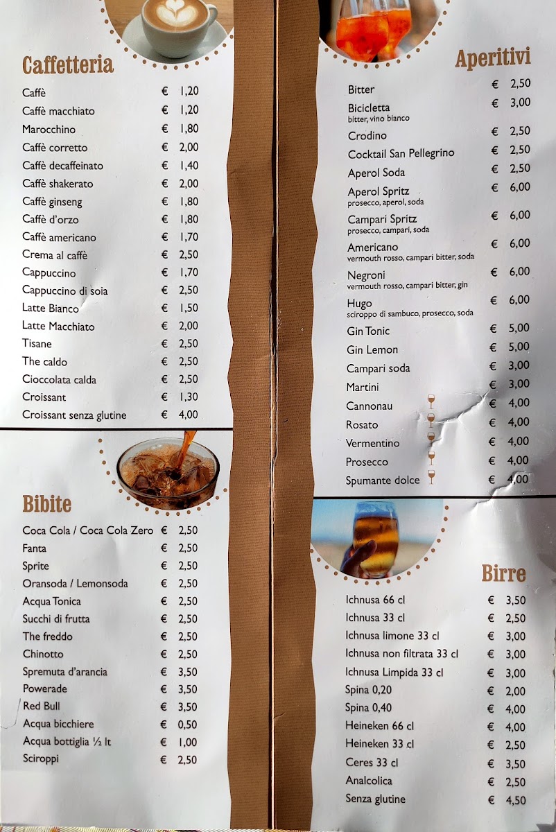 In addition to the food options, the menu includes a selection of beverages. These range from typical local beers, such as Birra Ichnusa and Cerveza Típica De Baunei, to classic Italian coffee drinks like cappuccino. Popular aperitifs and cocktails such as Aperol Spritz and Hugo are also available.