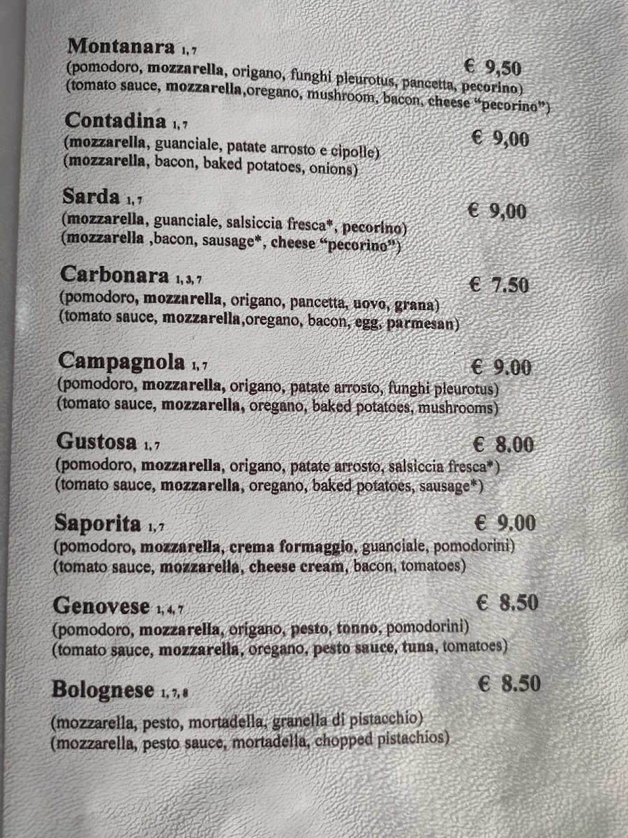 The menu at Bar Pizzeria San Pietro features a wide variety of pizzas, reflecting traditional Italian and regional Sardinian influences. Guests can choose from numerous pizza options, including vegetarian selections, with ingredients like four cheeses, mixed vegetables, and local specialties such as Salame Piccante and Pizza Sarda. Alongside pizzas, the menu offers fresh salads and light bites suitable for casual dining.